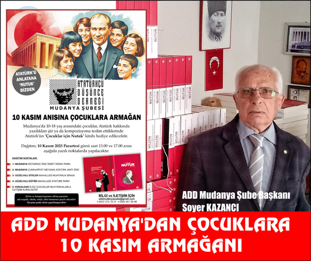Mudanya'da 10-18 yaş arası çocukların, Atatürk hakkında yazacakları şiir veya kompozisyonları karşılığında “Çocuklar İçin Nutuk” kitabı armağan edecek olan ADD Mudanya Şubesi, kitap dağıtımlarını 10 Kasım 2025 Pazartesi günü saat 13.00 – 17.00 arasında Mudanya ve Güzelyalı’da belirlenen 4 ayrı noktada gerçekleştirecek. Mudanya'da Mütareke Meydanı ve Atatürk Anıtı'nda, Güzelyalı'da ise Siteler Mahallesi Muhtarlığı ve Eğitim Mahallesi'ndeki Atatürk Parkı'nda gerçekleşecek dağıtımlar, kırsal bölgelerdeki çocuklar için bağlı bulundukları muhtarlıklar aracılığıyla yapılacak.