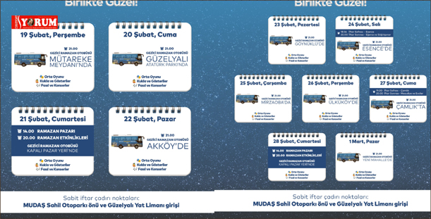 Ramazan ayı için hazırlanan Gezici Ramazan Otobüsü, ay boyunca sofraları ve etkinlikleri mahallelere taşıyacak. İftar sofralarının kurulacağı mahallelerde kukla gösterileri, orta oyunları ve fasıl dinletileri düzenlenecek; çocuklara yönelik atölyeler gerçekleştirilecek. Mudanya’nın dört bir yanındaki mahallelerde Ramazan’ın paylaşma ve dayanışma ruhu birlikte yaşatılacak.Her Cumartesi Dolgu Alanı Kapalı Pazar Yeri’nde kurulacak Ramazan Pazarı’nda isealışveriş stantları kurulacak. Ayrıca atölyeler, ortaoyunları ve konserler düzenlenecek. Çocuklara yönelik özel etkinliklerin de düzenleneceği programda, aileler Ramazan akşamlarını birlikte geçirme imkanı bulacak.