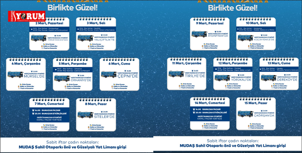 Ramazan boyunca iki sabit iftar çadırı da MUDAŞ Otoparkı önü ve Güzelyalı Yat Limanı girişinde her gün iftar için vatandaşlara açık olacak. Lokanta Mudanya’nın Güzelyalı ve MUDAŞ şubeleri, Ramazan ayı boyunca uygun fiyatlı iftar menüleriyle hizmet verecek. Şubeler, iftar saatlerinde açık olacak.
